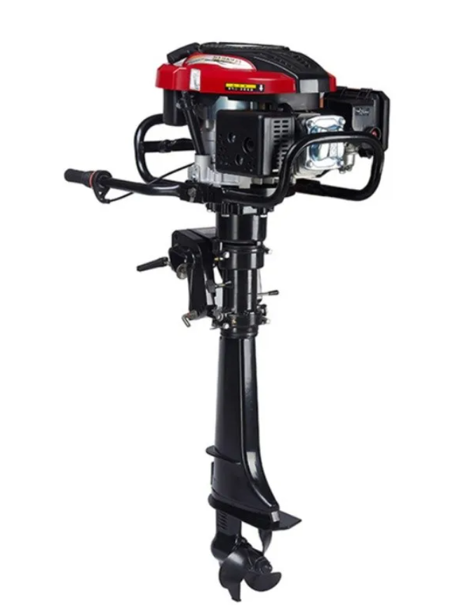 HUANGJIE Четырёхтактный двигатель мощность 7 Л/C или 5,1 кВт, воздушное охлаждение, ручной старт, имеет задний ход, заправка (моторное масло:бензин=50:1). Рабочий объём 196 см³, передача F–N–R, диапазон оборотов 4500–6000 об/мин, вес 28,70 кг. Высота транца 43 см. Длинная нога транца.