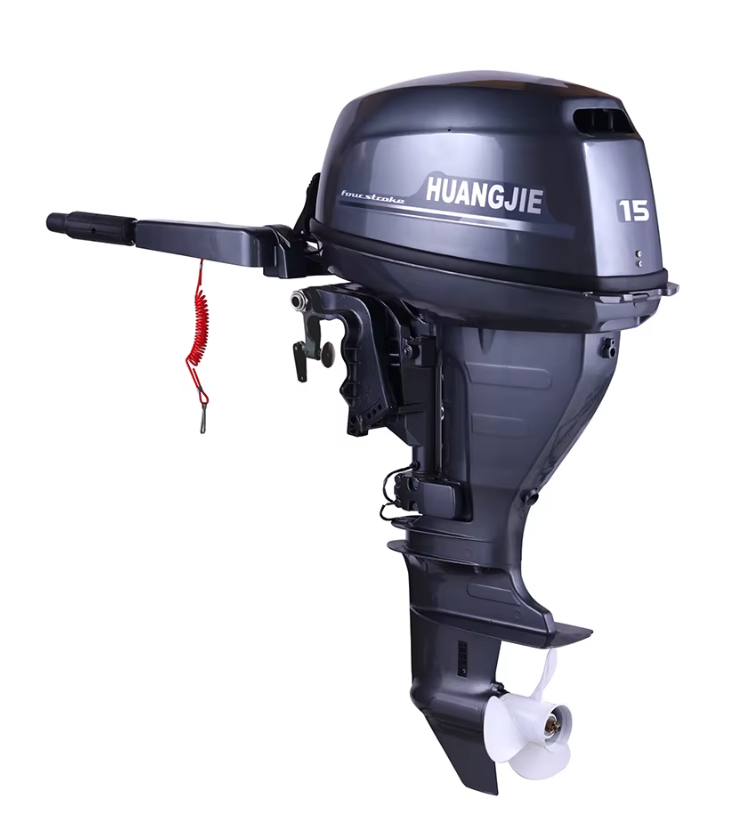 HUANGJIE Четырёхтактный двигатель мощностью 15 л/с или 11 кВт, Топливный бак 24 л, водяное охлаждение, ручной и электрический старт, имеет задний ход, заправка (Чистый бензин), объём моторного масла 1,8 л, Короткая нога транца. Вес 58,00 кг.