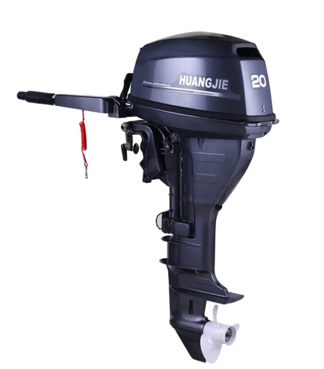 HUANGJIE Четырёхтактный двигатель мощностью 20 л/с или 14,7 кВт, топливный бак 24 л, водяное охлаждение, ручной и электрический старт, имеет задний ход, заправка (чистый бензин), объём моторного масла 1,8 л, высота транца 54 см, длинная нога транца, рекомендуемая длина лодки 4–6,4 м. Вес 38,00 кг.