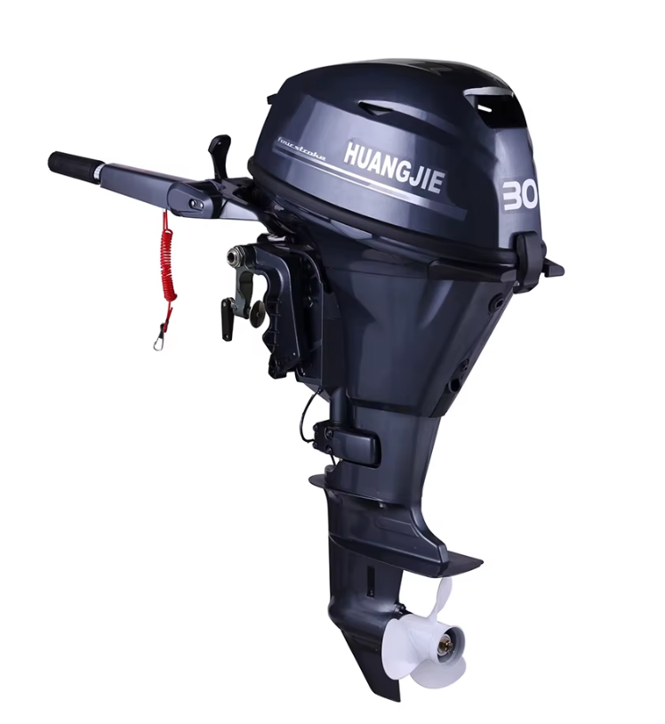 HUANGJIE Четырёхтактный двигатель мощностью 30 л/с или 22,1 кВт, топливный бак 24 л, водяное охлаждение, ручной и электрический старт, имеет задний ход, заправка (чистый бензин), объём моторного масла 1,8 л, короткая нога транца, высота транца 44 см, рекомендуемая длина лодки 4–6,4 м, управление заднее/переднее (румпель и дистанционное). Вес 58,00 кг.