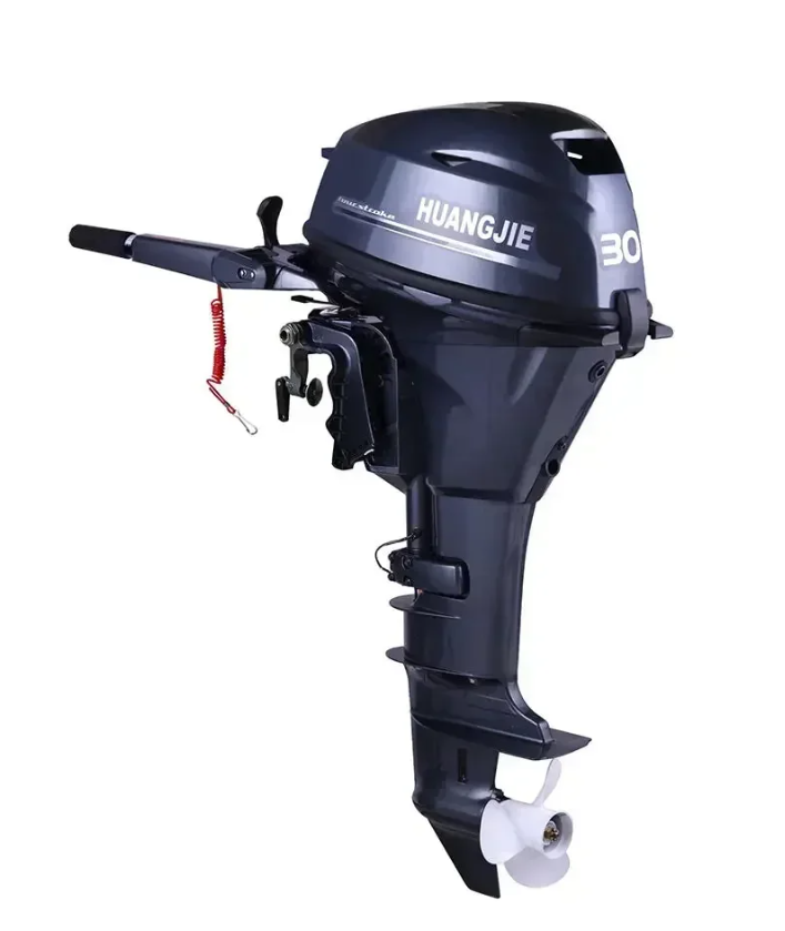HUANGJIE Четырёхтактный двигатель мощностью 30 л/с или 22,1 кВт, топливный бак 24 л, водяное охлаждение, ручной и электрический старт, есть задний ход, заправка (чистый бензин), объём моторного масла 1,8 л, длинная нога транца; высота транца 54 см, рекомендуемая длина лодки 4–6,4 м, управление заднее/переднее (румпель и дистанционное). Вес 58,00 кг.