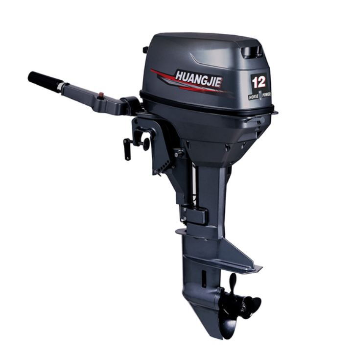 HUANGJIE Двухтактный двигатель мощность 12 Л/C или 8,8 кВт, топливный бак 24 л, водяное охлаждение, ручной старт, имеет задний ход, заправка (моторное масло:бензин=50:1). Короткая нога транца. Высота транца 44,8 см. Для лодок длиной 3–3,3 м. Вес 28,00 кг.