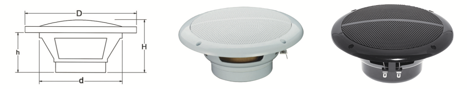 Полностью водонепроницаемые морские колонки с двойным конусом. Оснащены конусом из полипропилена с тканевым краем и корпусом из формованного ABS-пластика.
